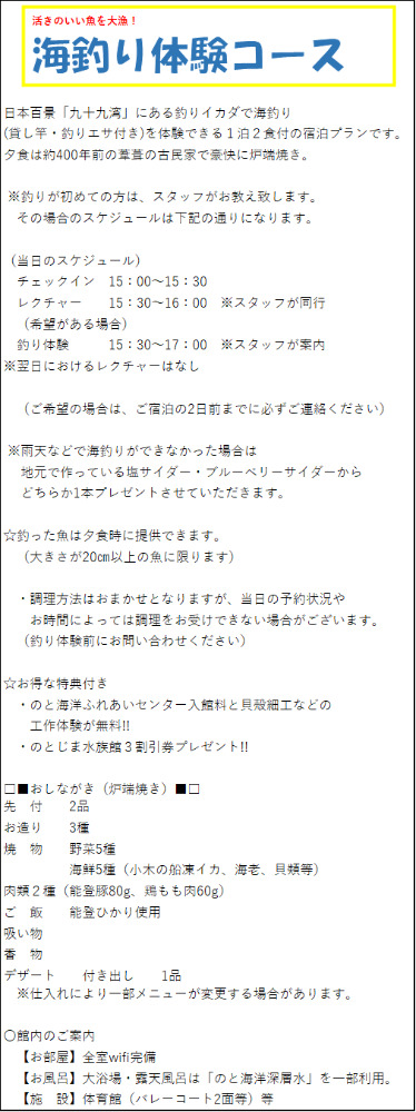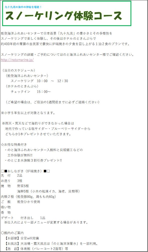 掲載日:2018年6月14日(木) ホテルのときんぷら 【ホテルのときんぷら】海の自然体験プランのご紹介! 開催日 2023年7月20日(木)~ 8月31日(木) 海の自然体験プランのご紹介! 夏休みのご旅行にぜひご利用ください! 関連リンク 【家族で】自然体験プラン受付開始【夏の思い出】 オフィシャルサイト もどる