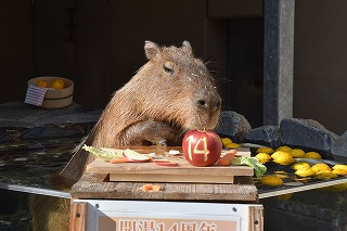 動物園の冬の風物詩「カピバラ湯」の開湯式を行い、恒例のカピバラ湯がオープンしました。