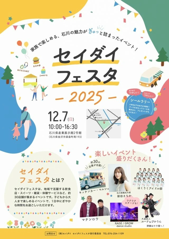 内 容:石川県金沢市を拠点とするハウスメーカー「セイダイ」が主催する、地域に笑顔と活気を届けるイベントを開催します。地元石川県で活躍する商業・飲食店・クラフト作家・趣味人のさまにご協力いただき、地域に根差した“人と人とのつながり”を感じられる場をつくります。ご来場いただいた皆さまが、笑顔で楽しい時間を共有し、石川県の魅力や元気を発見できるような、そんなイベントにしたいと思っています。